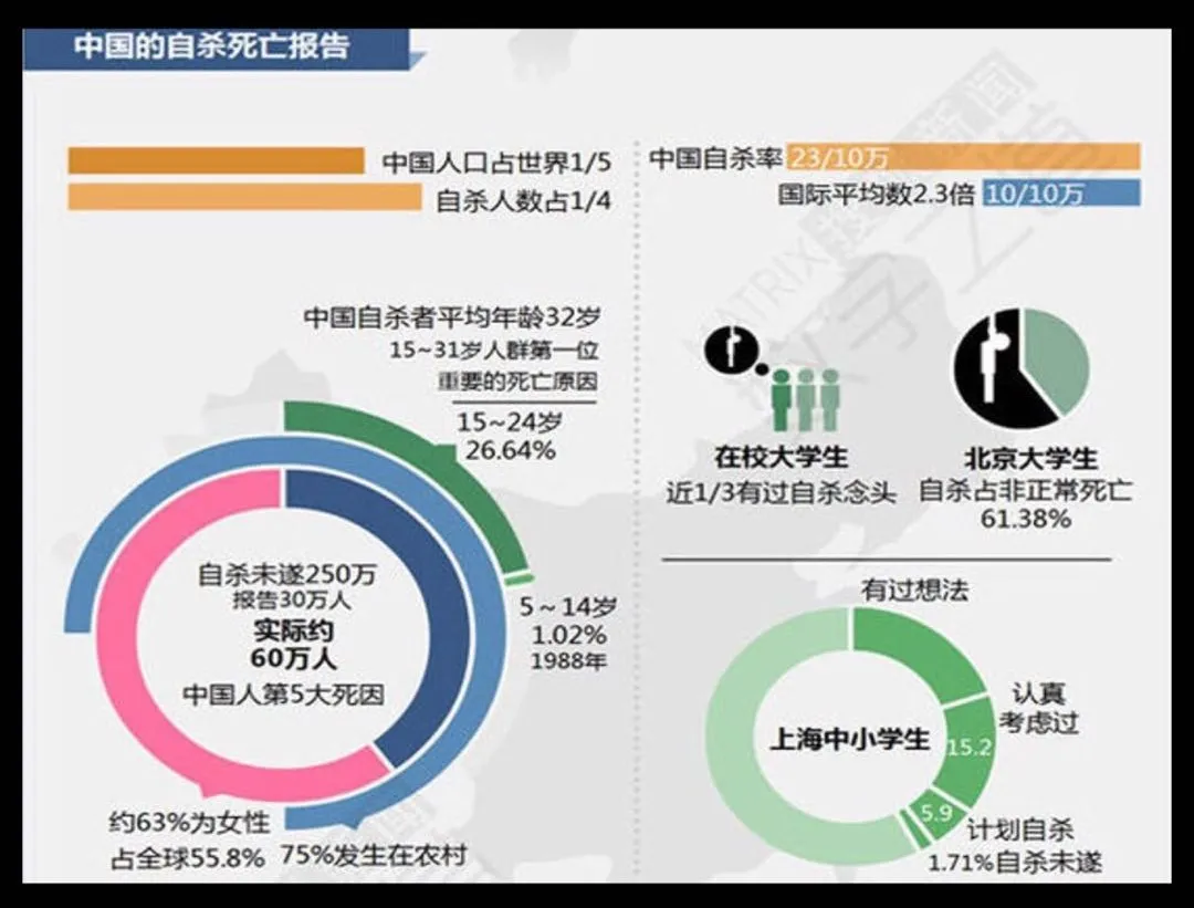从中国的自杀死亡报告看,中国的自杀率比世界一般水平要高,这是很不容乐观的。自杀平均年龄是32岁,75%发生在农村。