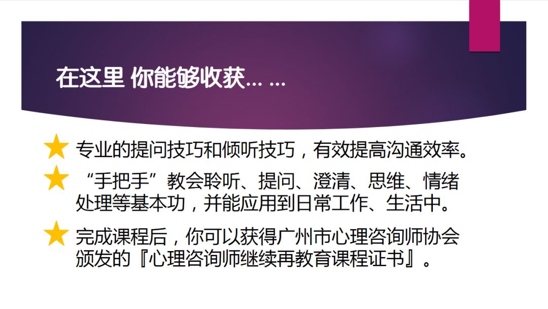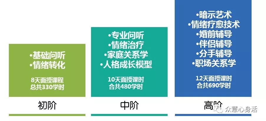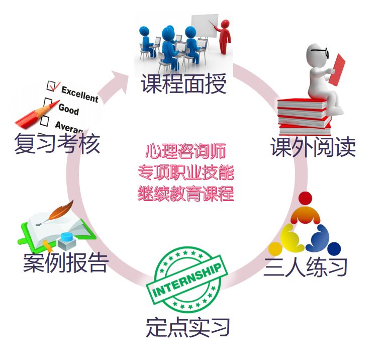 【继续教育课程系列——咨询技术整合实战课程】包括初中高三级,每个级别均包括课堂学习+考试、阅读和实践,理论+实操,帮助学员更好的掌握咨询技术。