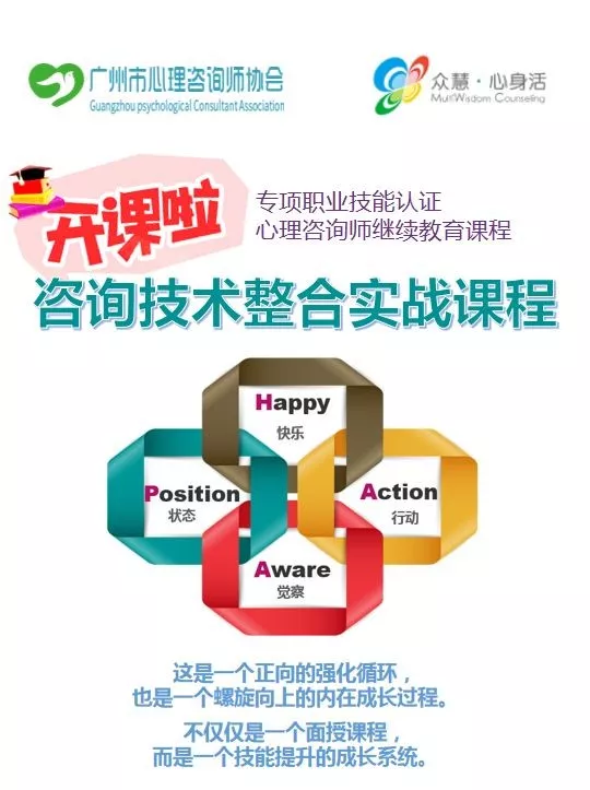 2019年,广州市心理咨询师协会重锤出击!携手众慧,以HAAP®技术为核心,融合大湾区的特色和都市人的需求,打造出一套心理咨询师继续教育课程——咨询技术整合实战课程。